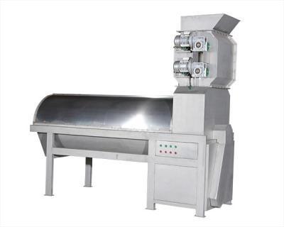 石榴從進(jìn)料斗進(jìn)入上壓碎裝置,上壓碎裝置將石榴壓開,下壓碎裝置再次將石榴擠壓,經(jīng)過兩級(jí)擠壓的石榴已基本皮籽分離,并落入分離裝置,石榴籽從篩孔落下,皮從尾部排出, 籽及汁用另配的螺桿泵送至下道工序。