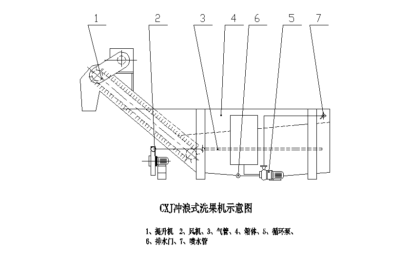 該機由機架、水箱、風機、提升機、氣泡管、噴水管等幾部分組成,工作時由于水中風力的存在,蔬果在水中任意方向翻滾轉動,并在高壓水力的推動下向前移動,在出口由一刮板提升機,將果蔬送至下道工序。整體為分體式結構,水箱與輸送機、進出料斗、罩板方便拆卸,易于清洗和檢修。