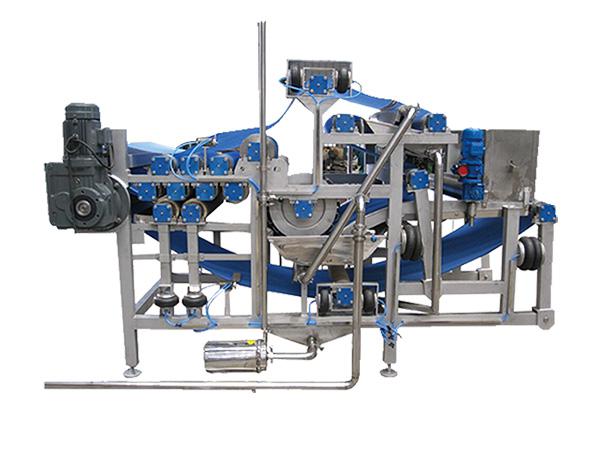 壓濾帶的清洗:采用鍥型(弧型)過濾篩自動過濾,排渣、配有高壓泵及噴射裝置,能方便地邊過濾邊清洗壓濾帶,該即具有良好的出汁效果,且節約能源。